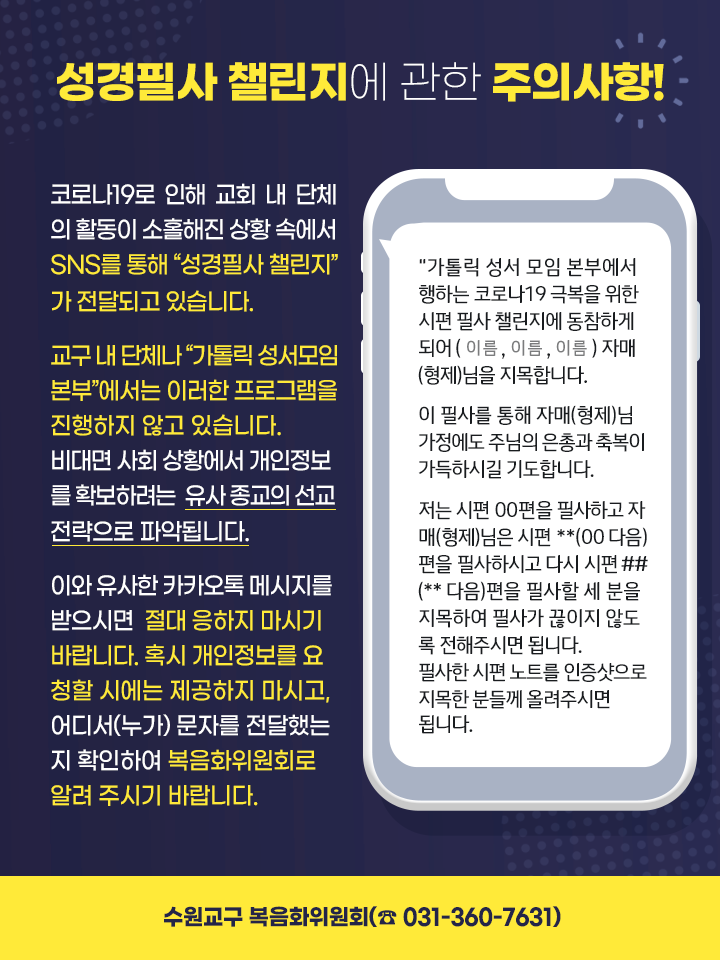 [공지사항] 성경필사(이어쓰기) 챌린지에 관한 주의사항 관리자 공지 0 20582 2020.08.18 12:28 몇몇 교우들이 성경이어쓰기 SNS를 받고 문의를 하여 수원교구에서 발송된 내용을 공유합니다. 가톨릭성서모임이나 교회내 단체에서 이런 프로그램을 진행하고 있지 않음을 알려 드립니다.